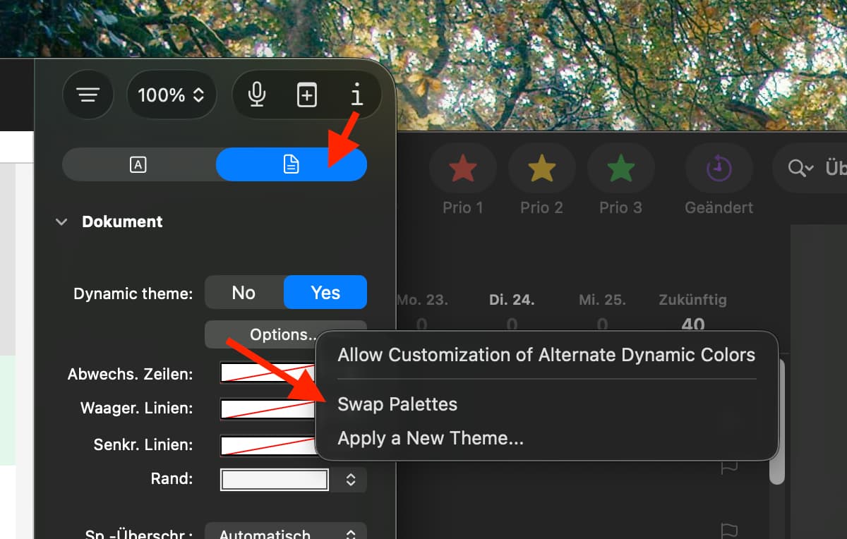 I go to the Inspector > Document and say Dynamic Theme: No. Then I select “Whole Document” in the sidebar, then Inspector > Selection Style > Paragraph > Background: White. And it turns like a mid gray color. Then I try: Font: Black – it just ignores me and leaves it white.