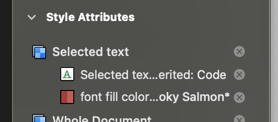 For example, I create a named style “Code” and give it a red color and a monospace font. I select some text and then check this “Code” style. As expected, the selected text turns red and monospace. I go to “dynamic: no”, then “dynamic: yes” again, and then change the “Code” style to be, say, green. Unexpectedly, the places it was applied stay red. If I go into the style inspector I can see it now has the color directly applied: