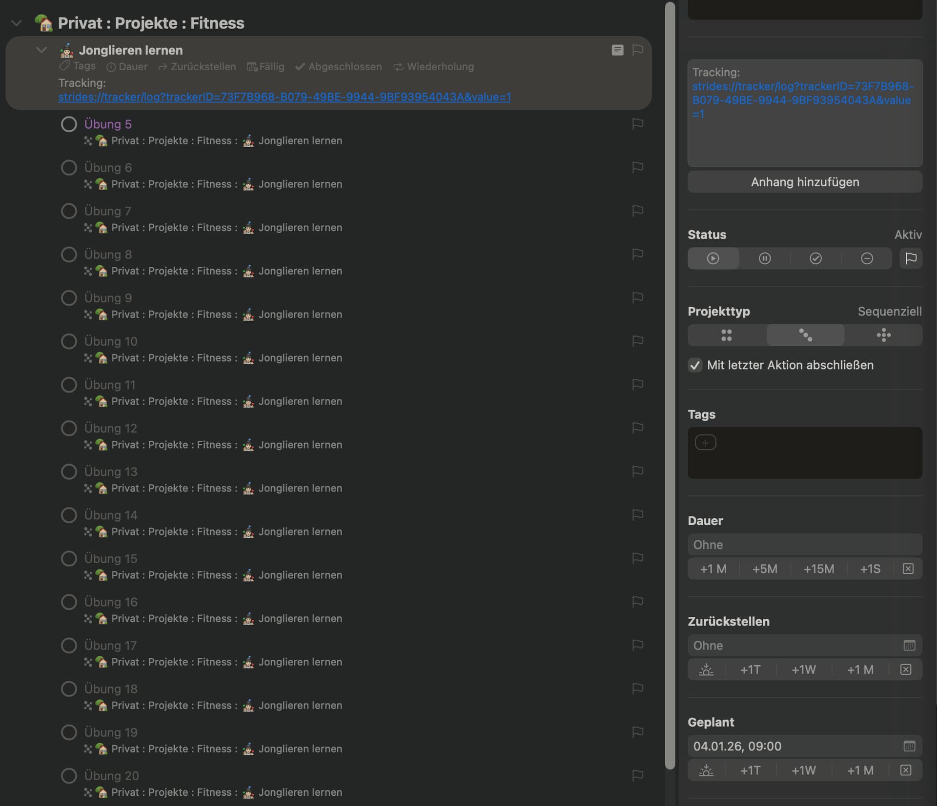 Then one option would be to set the “Jonglieren lernen” project to repeat every 1 week, regularly, on a Sunday, based on defer date and view it in one of these perspectives. It will only show Übung 5. Then on Sunday mark both Ubung 5 and the Jonglieren Lernen project as done. A replicate project with Ubung 6 available will then be created with a defer date of the following Sunday.