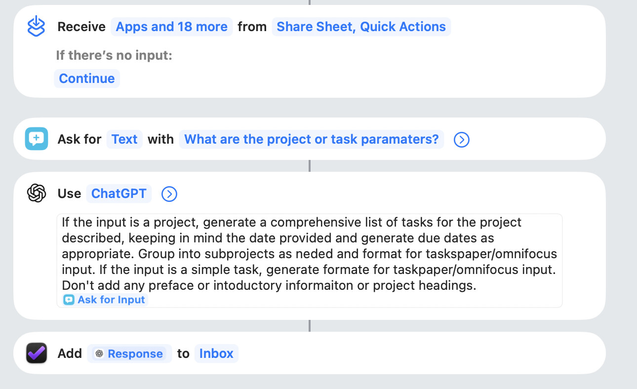 I’ve seen people complain about natural language processing and omnifocus. I get it. But I’ve found a solution that does better than onboard NLP would do anyway, I think. I use a shortcut that calls on ChatGPT as the model to either add a task via natural language or generate a project via a natural language description. Now, I do a lot of project management things via ChatGPT so perhaps my instance works better than some others off the batt. But it shouldn’t take much to train your to what you need. I trigger it with Alfred via shortcuts plugin or via the action button on my iPhone.