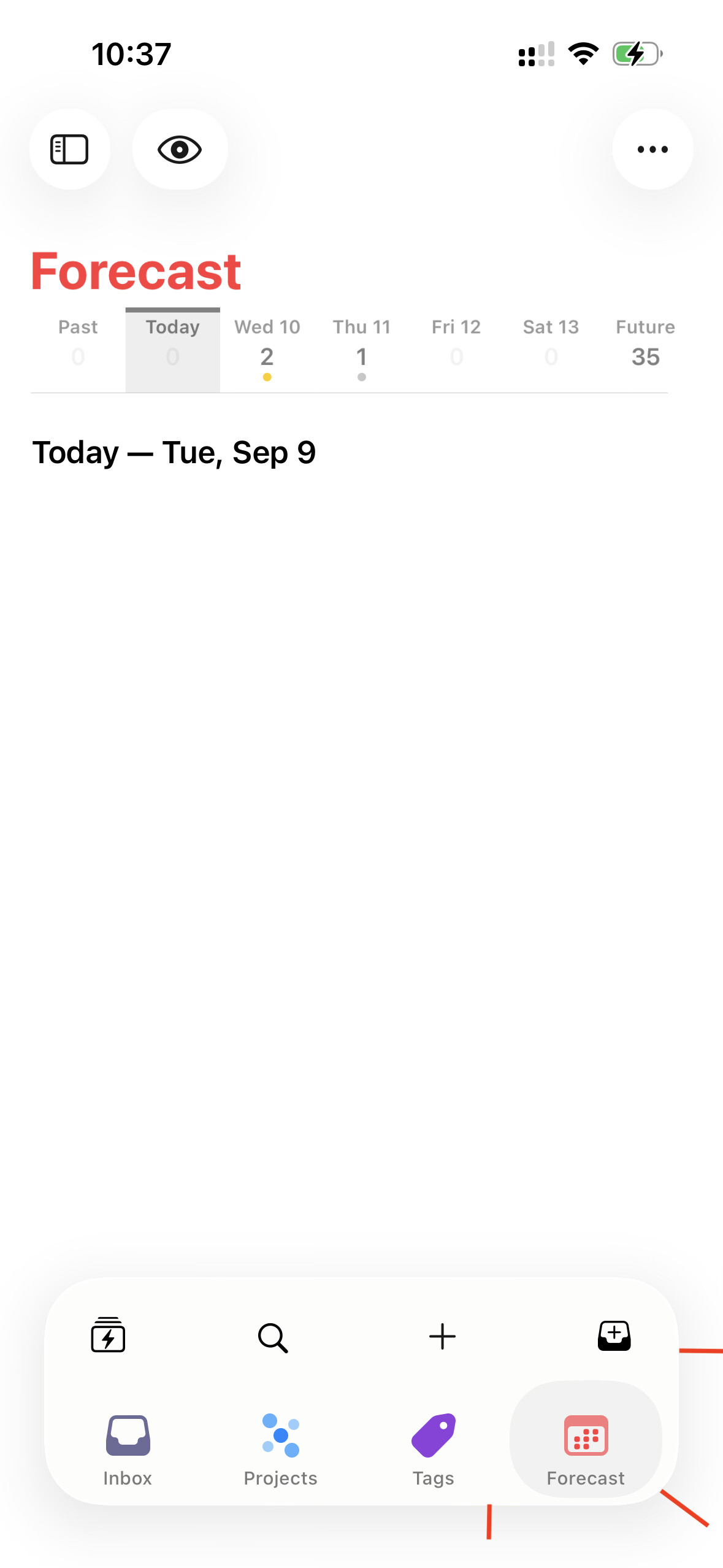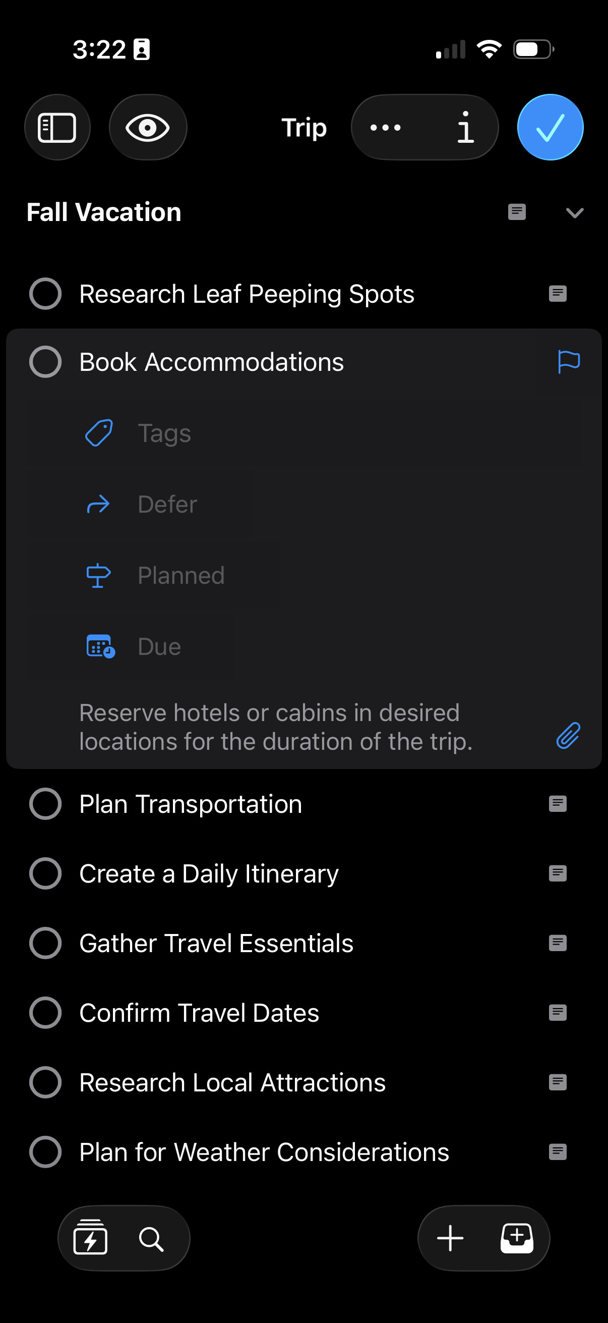 I miss the collapse arrows located in the top-right corner of tasks on iOS, which were used to collapse the display fields, where the flag is now. The only way I’ve found to collapse a task is by extending my right thumb to the top of the screen to tap the checkmark. I can only imagine the difficulty faced by left-handed people.