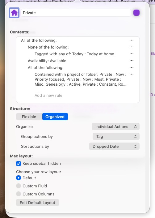 I have a perspective “Private” set up as depicted in the screenshot at the bottom of this post. Private provides me with a list of tasks that I can consider to work on, say, on the weekend. On Friday, I go through this list and focus on the individual items (i.e. projects) I want to concentrate on for the weekend. That reduces the available tasks to a doable amount.