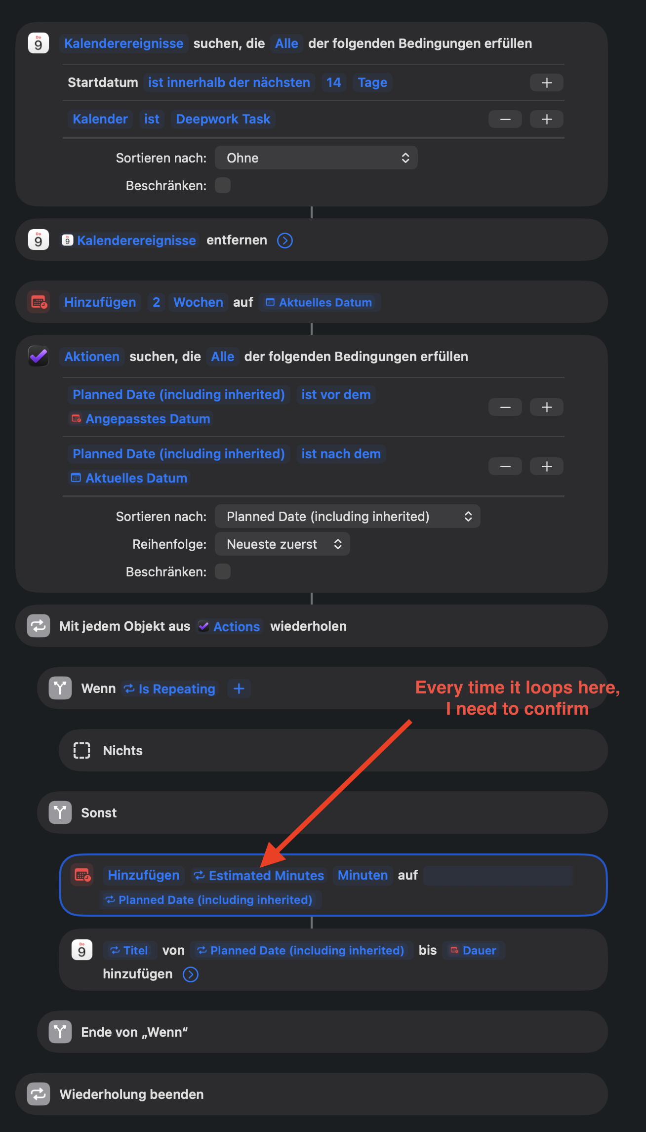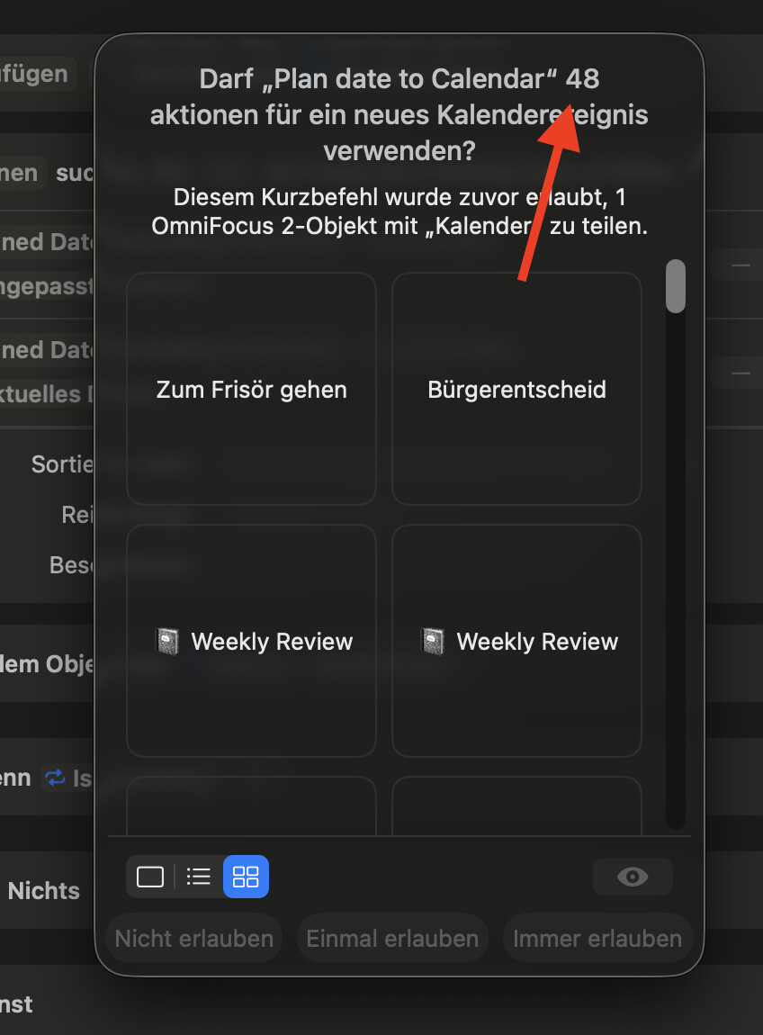 But I have a small but annoying problem with the shortcut. Every time I loop over one of the OmniFocus actions, I need to confirm that I will allow this.