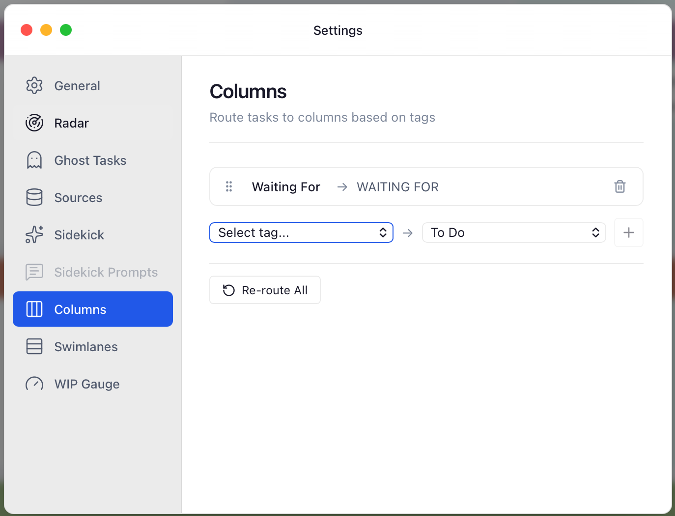 It does @Geoffairey. I use it to map a single tag (Waiting For) to a column called - drumroll… - waiting for. Means all tasks that I’m waiting on others to sort out show on the board but in the specific column. Latest release v2.0.77 available at https://getflowcus.app