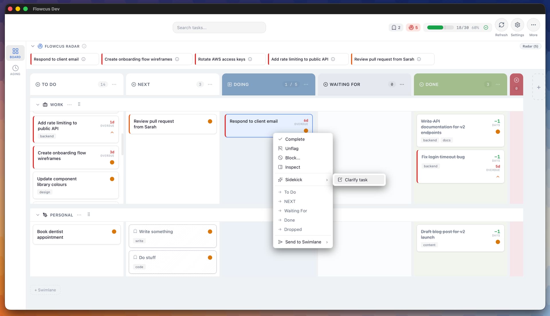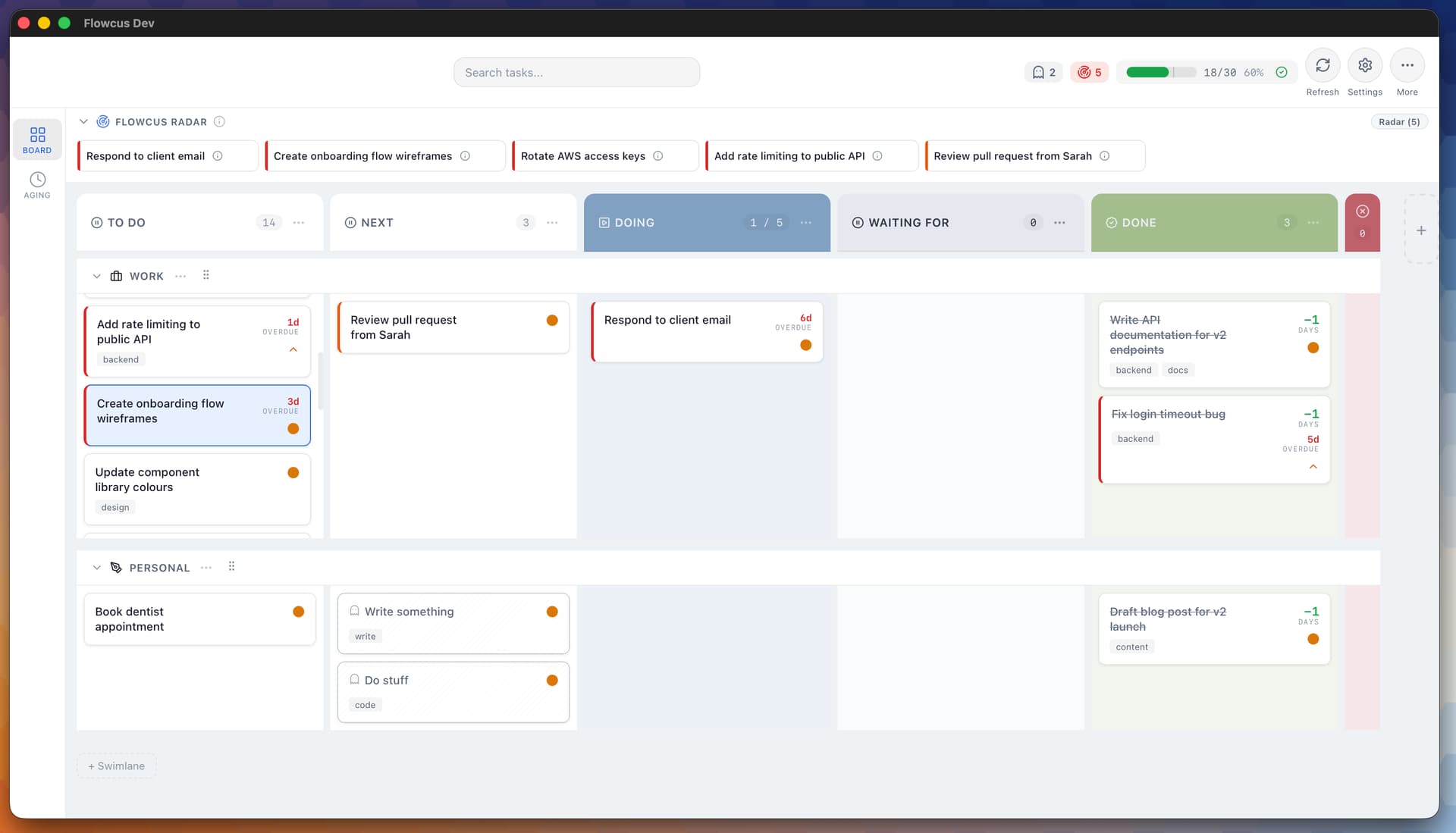 - Smart Folder routing - Tasks now automatically route to the correct swimlane based on their folder in OmniFocus. Set up your folder associations once, and new tasks will find their home automatically. Go to Settings > Swimlanes > Configure Folder Associations